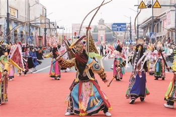 下午2时,随着仪式的启动,热闹欢快的锣鼓声中,表演项目轮番上演,精彩纷呈。南通武术,海安花鼓、腰鼓,如皋木偶、莲湘……12个表演方阵各具特色。在巡游活动中,两个特邀方阵——“潮汕英歌”和“安顺地戏”方阵,为这场民俗盛宴注入了独特的非遗魅力。